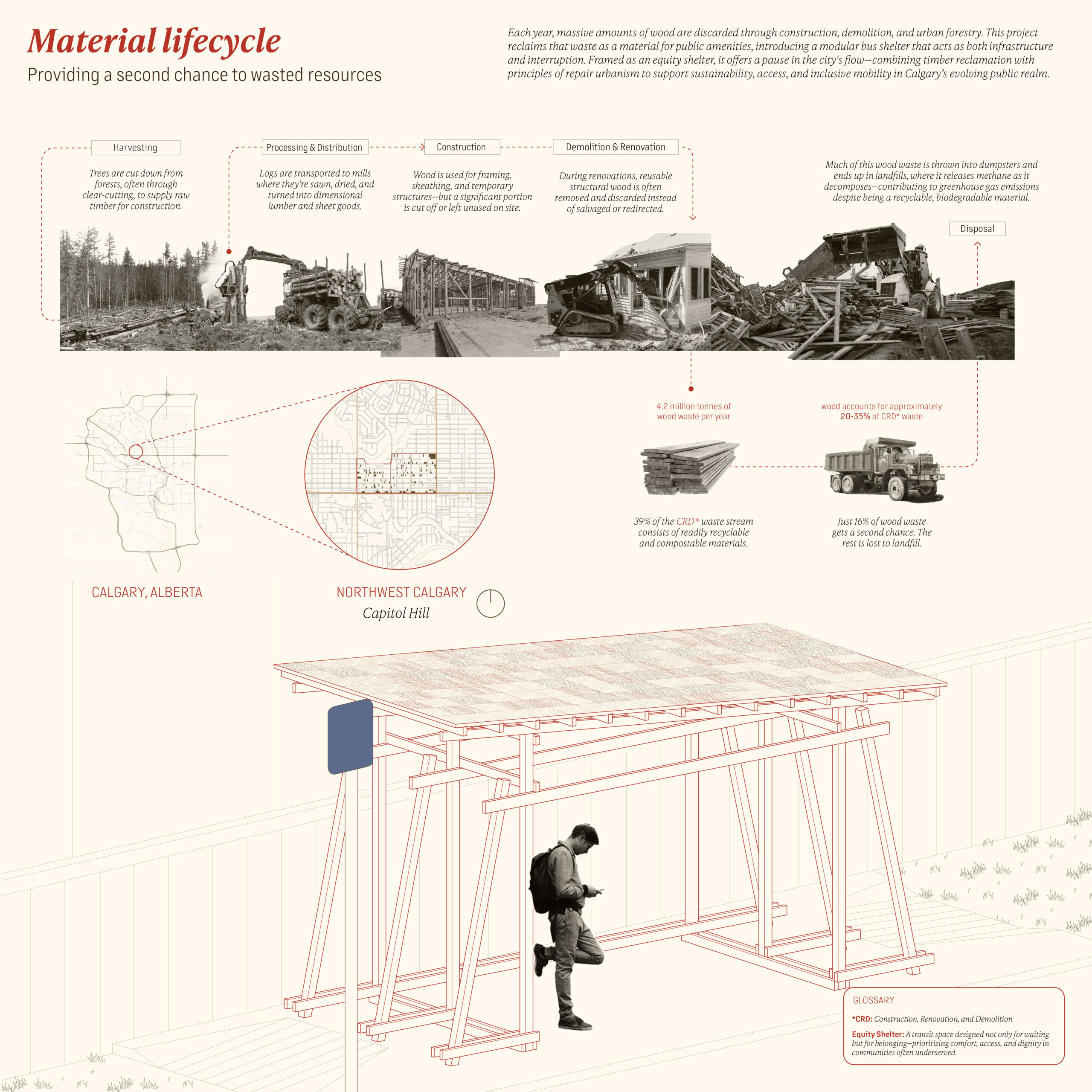 “Patches in Waiting: A Shelter for Equity and Material Justice,” by University of Calgary student Leonor Aguero Vivas (with Jessie Andjelic, faculty), partners with local renovation contractors to recycle wood waste.