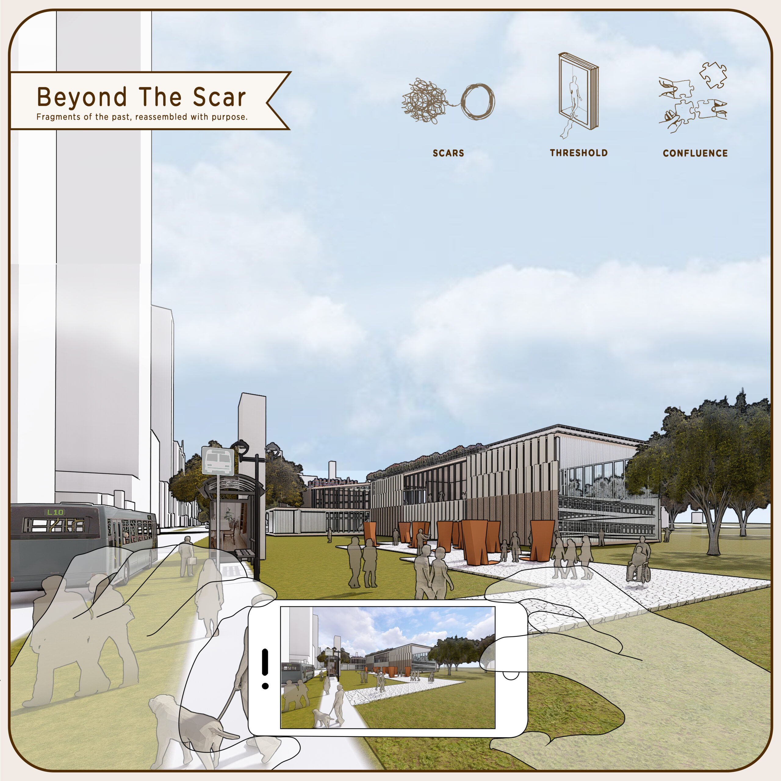 “Peace Museum: Beyond the Scars,” by University of Illinois Urbana-Champaign students Nidhi Naik and Shamita Shyam Honawar (with Patricia Saldaña Natke and Soumya Dasgupta, faculty), employs recycled materials from Chicago neighborhoods to express the city’s wounds and ultimate rebirth.