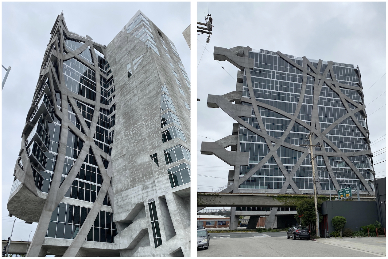 On paper, everything about the building makes sense. And then you actually look at it. The inventiveness of L.A. architecture has always been inspiring, but (W)rapper comes across as a bizarre panopticon that glowers at everything around it. Steel ribbons with cementitious coatings are splayed across a thin facade of dark glass, creating a clash of geometries and materials. Its hulking presence looms over a manufacturing district of low buildings. Apparently, this project will be followed by three other EOM-designed structures—which, if the firm’s track record is any indication, will be as aggressive, if not more so, toward the surrounding community and the urban fabric.