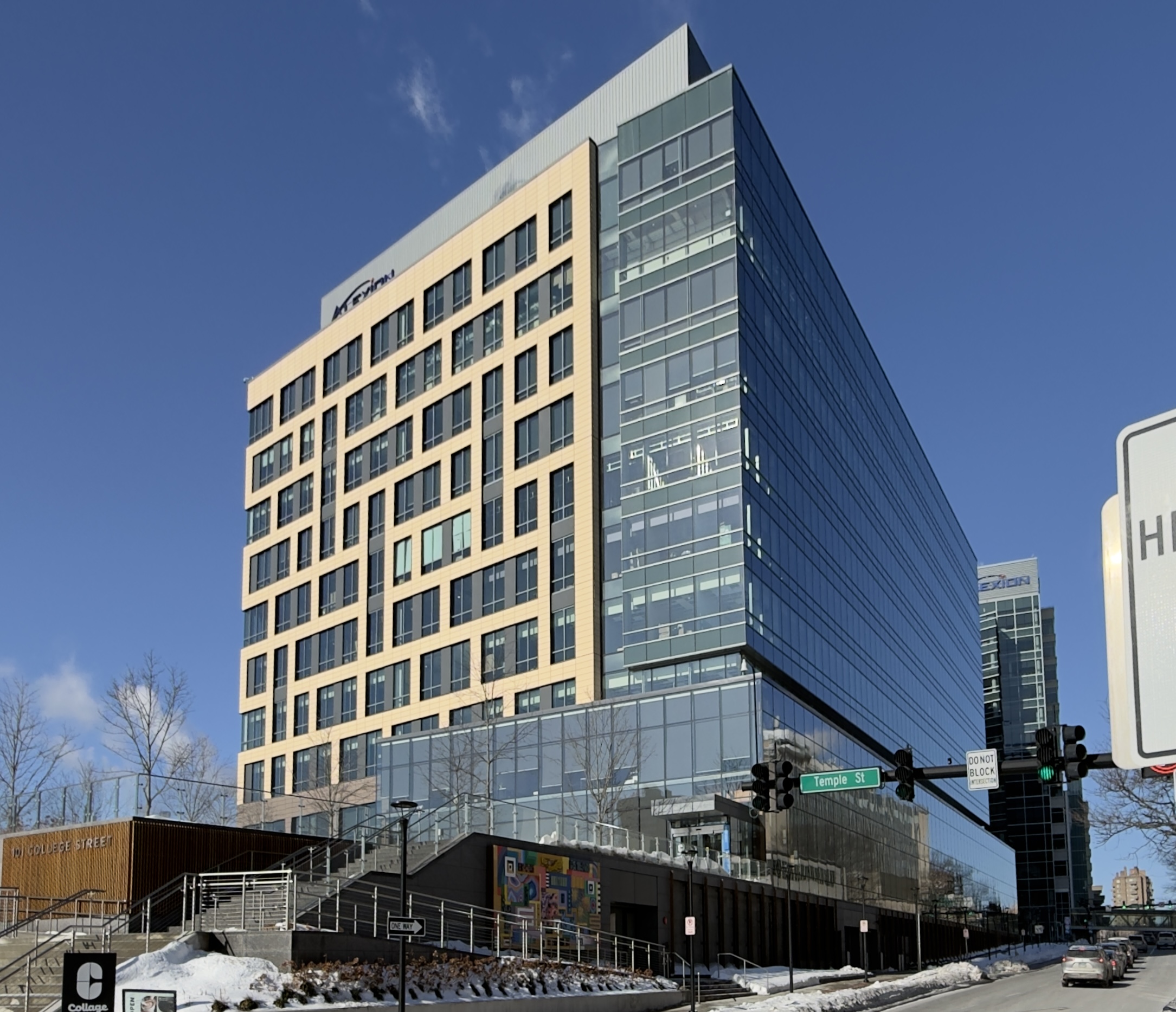 The Elkus/Manfredi-designed building in New Haven contrasts the traditional glass curtain wall (right) with the new technology of panelized color composition.