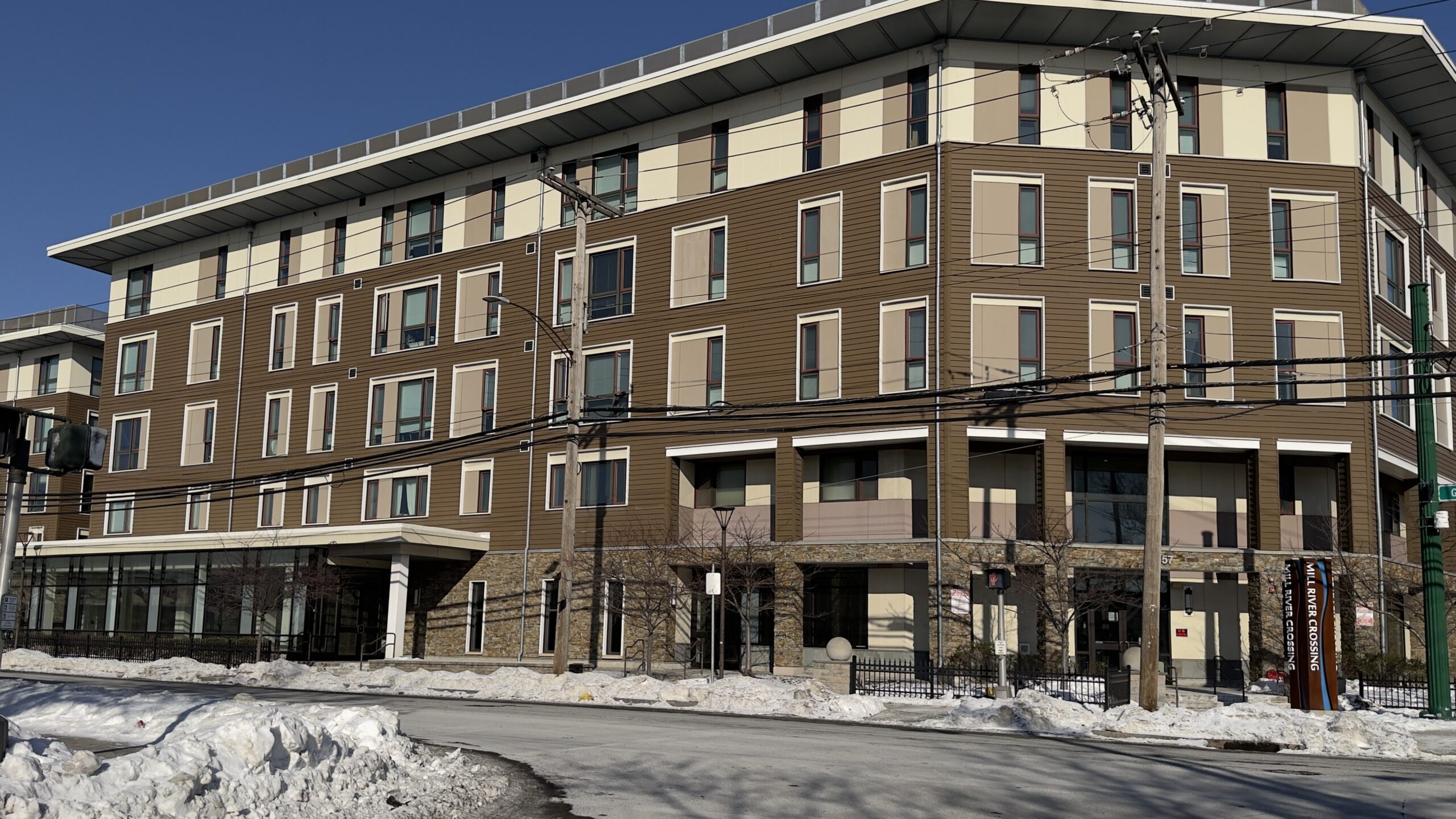 A stick-frame-over-podium affordable housing project in New Haven uses stark color contrasts, graphic abstraction, and arbitrary alignments to zest up a box.