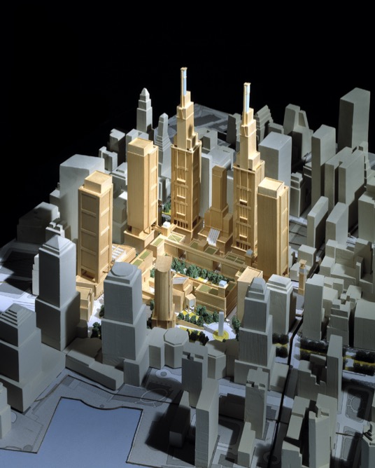 Few urbanists and sympathetic place-oriented architects were aware then of the truly extraordinary significance of the PLA Master Site Plan and why it satisfied all the requirements of the Ground Zero program. Using every trick in the Rowe handbook, the architects connected the site east west to Battery Park City and Wall Street, and north-south to the Battery using West Street as a Parisian promenade. The sunken central plaza saved the footprints of the two towers while also creating a rectangular public space ringed by four towers on the north and south sides. The focus of the design was a pair of quasi–Art Deco towers that were scaled to the plaza and not intended to rise to record-breaking heights; Rockefeller Center was the prototype. Littenberg is correct to argue that, if built, the complex would have been the first successful large-scale urban design project since Battery Park City, and a tribute to those who lost their lives in the disaster that also re-established urban coherence to that portion of lower Manhattan.