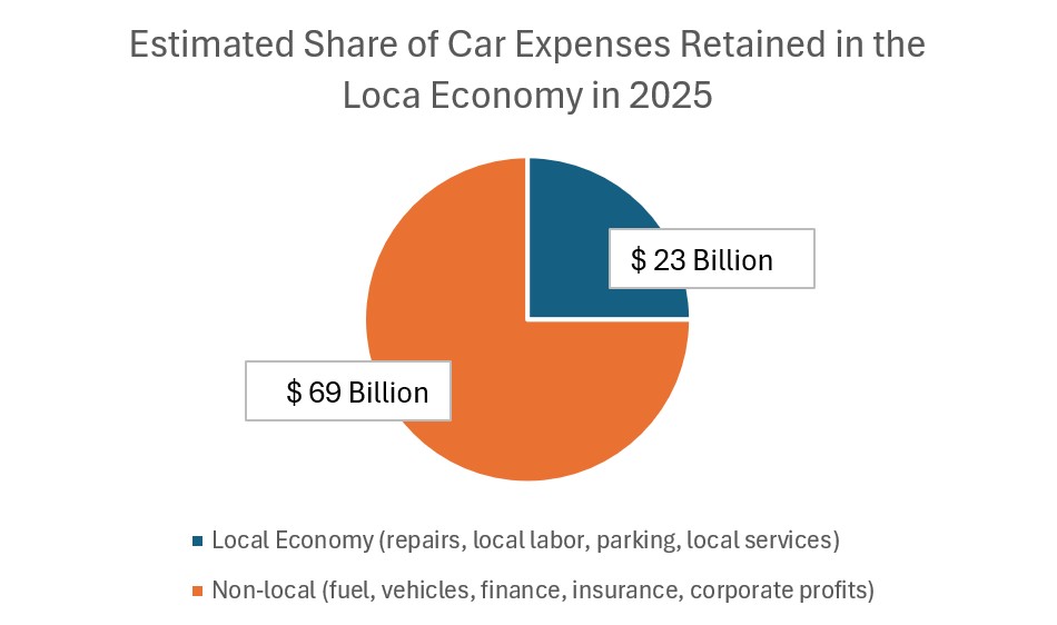 - ≈ 75% leaves the local economy; this includes vehicle purchases, gasoline, insurance, financing, and much of the depreciation flow to national or global firms.
